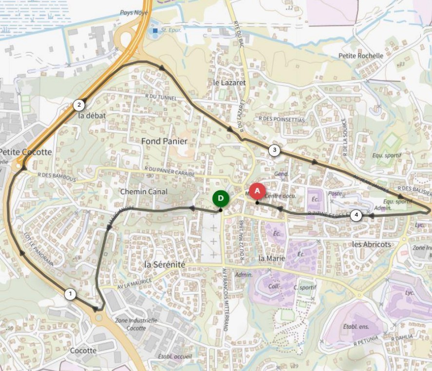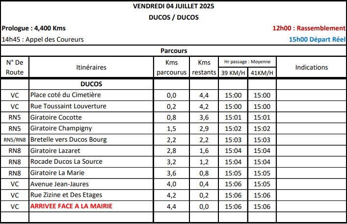 Les points de passage de ce prologue. Il s'agit d'un circuit entre le bourg de Ducos et la RN5 avec une arrivée face à la mairie.