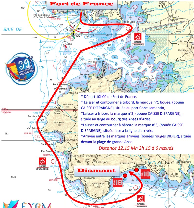 Départ au pied du fort Saint-Louis, à la force des bras. Les premières yoles à toucher le vent filent vers le terminal à conteneur de la pointe des Grives puis vers la première marque de la journée dans la Cohé du Lamentin. On la quitte à tribord pour se diriger vers les Trois-Îlets puis l'îlet à Ramiers. Le Cap Salomon se présente alors puis la vigie localisée face au bourg des Anses d'Arlet. Petite Anse ouvre la porte de la passe des Fous. Entre le Morne Larcher et le Rocher du Diamant, on commence à viser la dernière marque du tour. Elle est positionnée face à la ligne d'arrivée matérialisée par les deux bouées rouges sur la plage de la Grande Anse du Diamant. Fin du tour 2025.