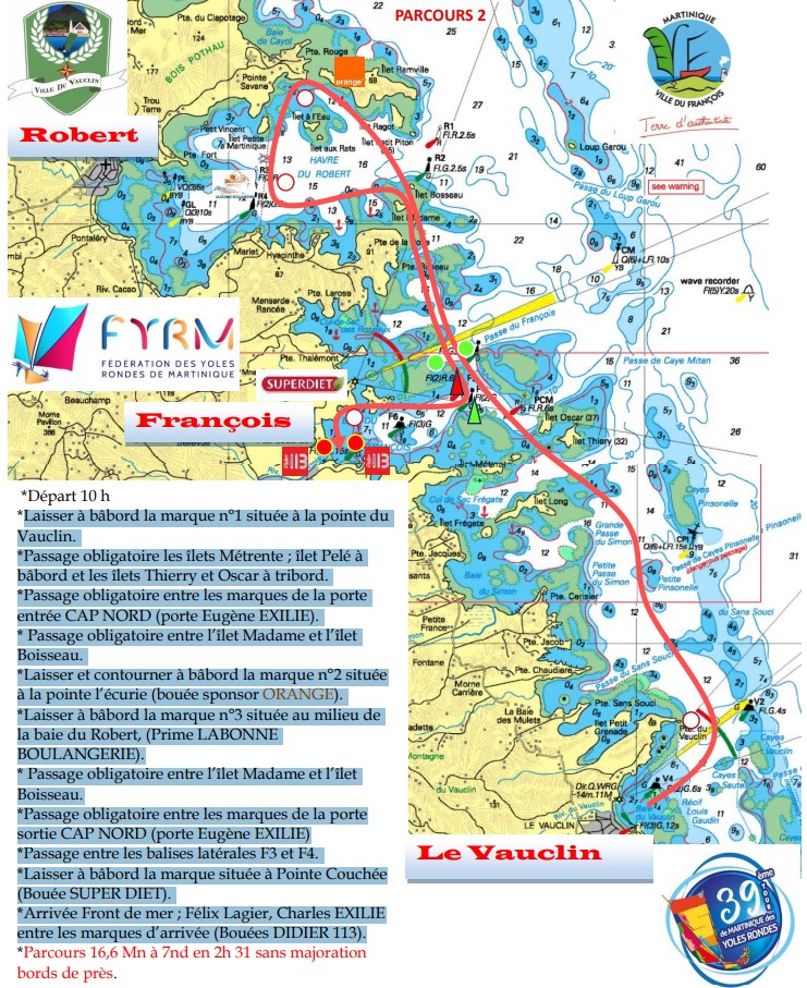 Le début d'étape est identique avec un départ du Vauclin puis la bouée n°1 à laisser à bâbord devant la Pointe du Vauclin. Le passage est toujours obligatoire entre l'îlet Pelé à bâbord et les îlets Thierry et Oscar à tribord. La transition François-Robert se fait par la porte Eugène Exilie. La flottille navigue entre l’îlet Madame et l’îlet Boisseau. C'est à partir de ce point que le parcours est différent. Il faut laisser et contourner à bâbord la marque n°2 située à la pointe l’écurie puis laisser à bâbord la marque n°3 située au milieu de la baie du Robert. La sortie de la baie se fait entre l’îlet Madame et l’îlet Boisseau. Le circuit conduit à nouveau les yoles à la porte Eugène Exilie puis aux balises du chenal du François. La dernière marque située à Pointe Couchée est à virer à bâbord juste avant l'arrivée sur le front de mer.