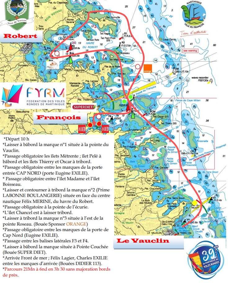 Le départ est donné au Vauclin à 10 heures. Une première vigie à quitter à bâbord est positionnée en face la pointe du Vauclin. Le passage est obligatoire entre l'îlet Pelé à bâbord et les Îlets Thierry et Oscar à tribord. Le littoral du Robert s'ouvre à la flottille par la porte Eugène Exilie. Suit le passage obligatoire entre l'îlet Madame et l'îlet Boisseau. Cap sur la vigie n°2 face au centre nautique Félix Mérine à quitter à tribord. Les bateaux remontent ensuite vers la passe de l'Ecurie puis contournent l'îlet Chancel par tribord. La bouée n°3 est localisée en dehors des îlets. Le retour vers le François se fait obligatoirement par la porte Eugène Exilie. Le passage entre les balises d'entrée du chenal est obligatoire. Une dernière vigie est installée à la pointe Couchée avant l'arrivée au Forçat.