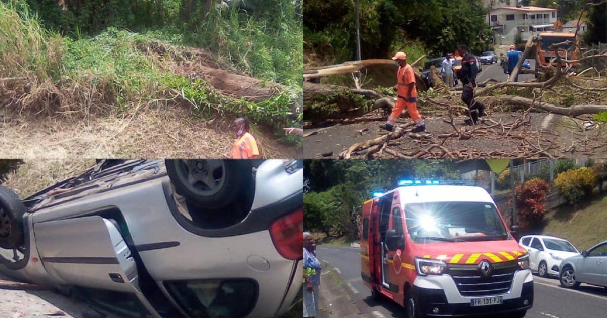 Un arbre imposant a lourdement chuté sur la route de Morne Pitaut entre le François et le Lamentin. Un véhicule qui passait au même moment a été percuté par l'arbre.