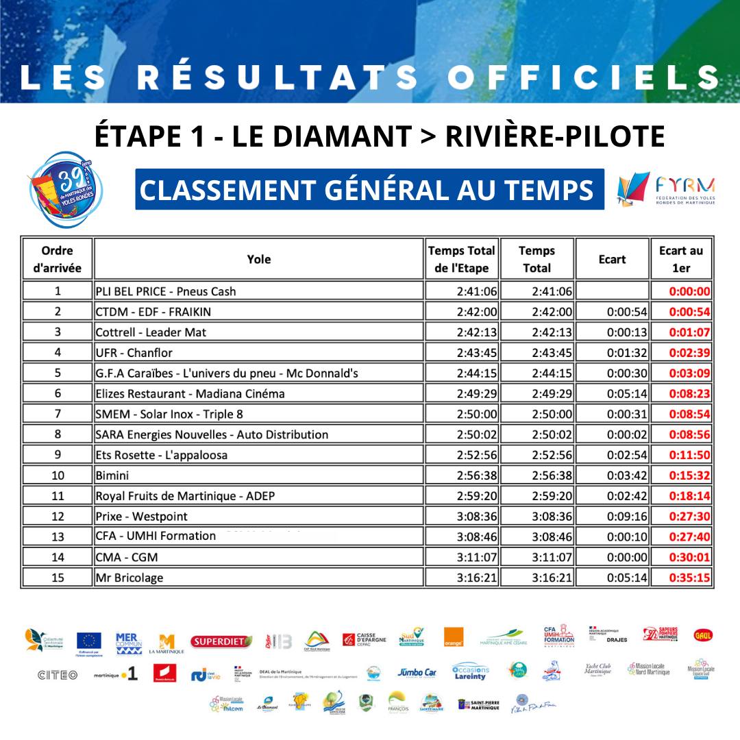 Après 2h41 et 21s de course, la yole de l'association « Lanmè 2 bodé » sponsorisée par Pli Bel Price/Pneus Cash remporte la première étape du 39e tour de la Martinique. L'équipage de Laurent Mas s'impose devant CTDM/EDF/Fraikin et Cottrell/Leader Mat. Pli Bel Price/Pneus portera le maillot rouge demain (28 juillet) pour la deuxième étape.