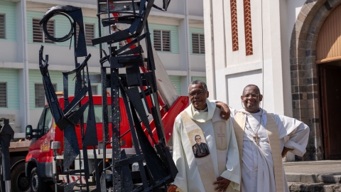 Société 18/10/2025 - 07:14 | Martinique "La vierge et l'enfant" de Khokho René-Coraïl décore à nouveau la façade de l'église de Bellevue Sous les yeux de l'Archevêque de Martinique et nombreux paroissiens, la sculpture géante en fer forgé a été réinstallée...