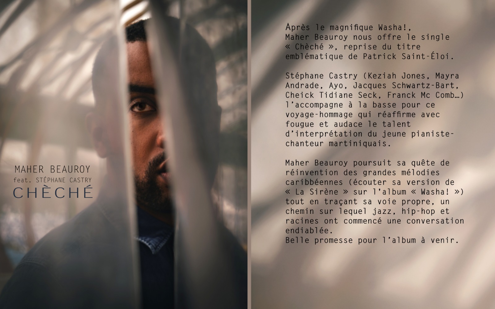 Ce vendredi, le clip est lancé sur Youtube, en attendant une sortie officielle le 16 octobre prochain. « Chèché » marque aussi la direction musicale du prochain album de Maher Beauroy entre jazz, hip hop et pop music. Un album qui sortira dans quelques mois.