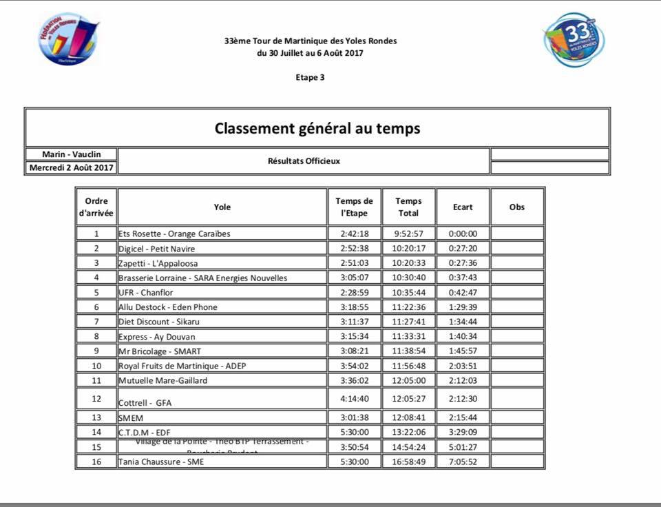 Après avoir connu deux dessalages hier (mardi 1er août 2017), la yole UFR Chanflor s'adjuge sa première victoire au Vauclin, à la troisième étape reliant le Marin au Vauclin.