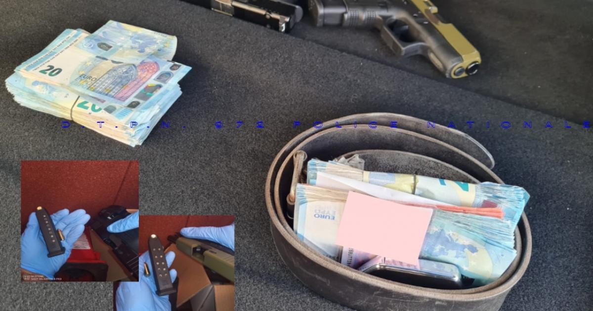 À proximité, les policiers sont alertés par une boite aux lettres entrouverte. A l’intérieur de celle-ci, les fonctionnaires découvrent deux pistolets, deux liasses de billets ainsi qu’une plaque d’immatriculation.