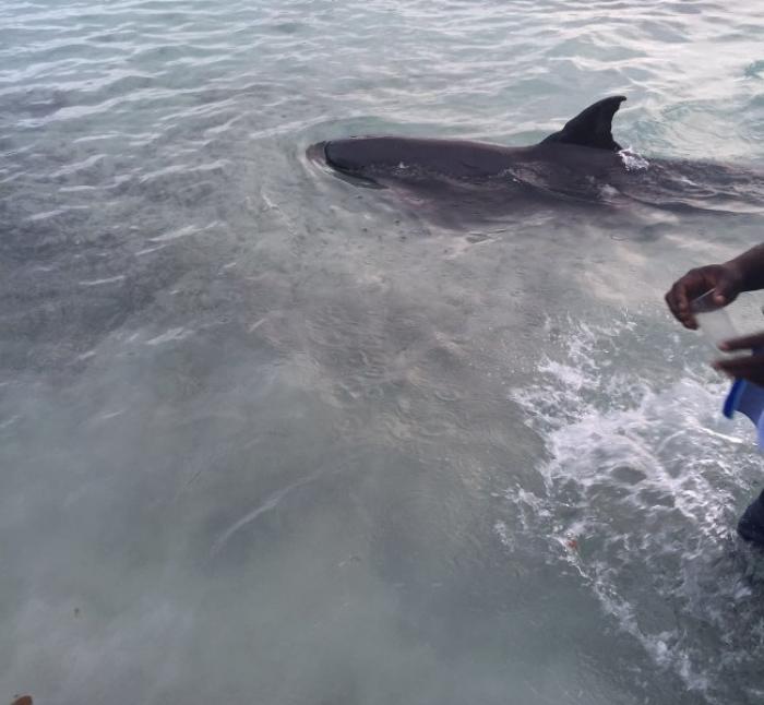 Les pompiers alertés accompagnés par les spécialistes de la direction de l'environnenement (DEAL) et du ROCEM avaient ensuite pris le relais des baigneurs pour faciliter le retour du dauphin vers la haute mer.