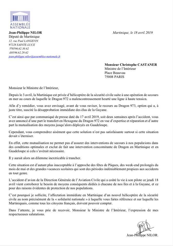 Dans un courrier adressé à Christophe Castaner, Jean-Philippe Nilor s'est lui aussi ému de l'absence d'hélicoptère de secours sur notre territoire. Le député de la Martinique estime que la solution d'un partage du Dragon 971 n'est pas satisfaisante. "Je sollicite l'affectation immédiate en Martinique d'un nouvel hélicoptère de la sécurité civile", écrit Jean-Philippe Nilor.