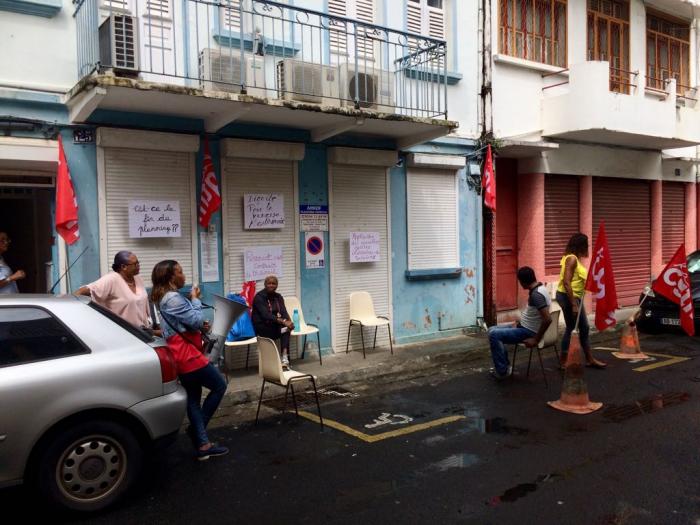 Piquets de grève et drapeaux du syndicat CGTM Santé sont plantés devant les cinq CPIOF (Ex-AMIOF planning familial), à Fort-de-France, Rivière Salée, Trinité, Saint-Pierre et Sainte-Marie. Les centres sont fermés au public jusqu'à nouvel ordre.